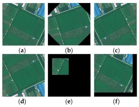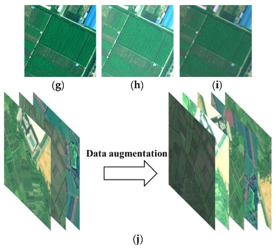 To improve the reliability of cropland change detection results and prevent model overfitting, CroplandCDNet adopts a data augmentation strategy during the training process. As shown in Figure 2, data augmentation includes operations such as rotation, horizontal flip, vertical flip, cropping, translation, contrast change, brightness change, and addition of Gaussian noise. Through data augmentation, the cropland change detection dataset is expanded, the risk of overfitting is reduced, and the generalization of CroplandCDNet to the dataset is effectively improved [].