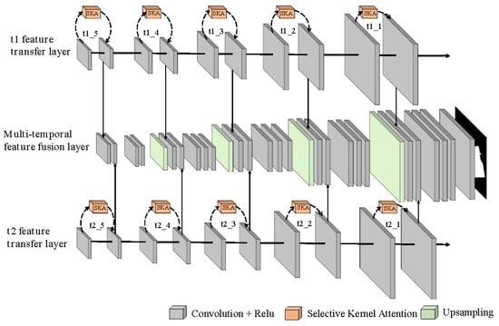 t1_1, t1_2, …, t1_5 and t2_1, t2_2, …, t2_5 represent the shallow and deep features of cropland in T1 and T2 temporal remote sensing images, respectively. All the feature maps are input into two parallel feature transmission layers in the change detection module, and each feature map passes through the SKA module to emphasize the change channel, suppress irrelevant information, and improve the detection ability of the network. The deepest original image features T1 and T2 are input into the feature fusion layer first through the SKA module. First, the feature fusion layer combines the bitemporal features of t1_5 and t2_5 and then convolutes them twice to obtain the image differential feature map. To restore the original resolution, the feature fusion layer samples the differential feature image, combines it with t1_4 and t2_4 to transmit features from deep to shallow, and gradually obtains all the features.