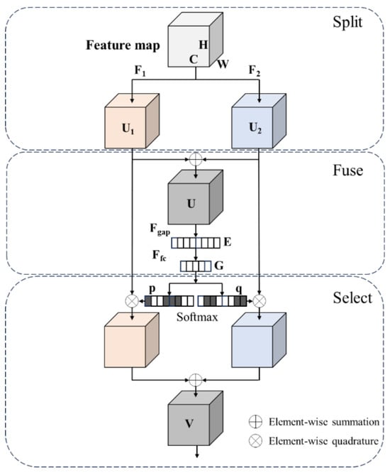 As shown in Figure 5, SKA contains three operations: split, fuse, and select. The split operator generates multiple paths of different kernel sizes. In this section, and as shown in Figure 5, two convolution kernels of different sizes are taken as examples. In fact, multiple convolution kernels of multiple branches can be designed (the method proposed in this paper uses convolution kernels of 1 × 1, 3 × 3, 5 × 5, and 7 × 7). The fuse operator merges information from multiple branches to obtain a global representation for selecting weights. The selection operator aggregates the feature maps of convolution kernels of different sizes according to the selection weight.