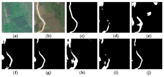 Table 5 shows the test results for the conversion of cropland into water body. The Rec, F1, and OA of the proposed method were the best of all the methods and were 98.75%, 96.11%, and 99.59%, respectively, while its Pre was 93.61%, which was lower than those of L-UNet and P2V-CD. Figure 10 shows the visualization results of the proposed method and the comparison methods for Scene 4. Figure 10h–j show different degrees of error detection and missed detection in both L-UNet and P2V-CD, and there are only a small number of error detections in the proposed method. According to the comprehensive quantitative evaluation metrics and visualization results, the comprehensive performance of the proposed method is the best at detecting changes in cropland types into water bodies.