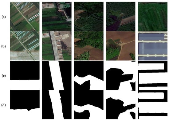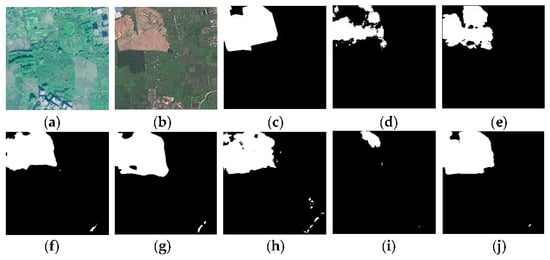 To verify the effectiveness of the proposed method, the CLCD [] dataset is used for experimental verification in this paper. The CLCD dataset was collected by GF-2 and had a spatial resolution of 0.5 m to 2 m. Many types of cropland conversion are contained in CLCD, and the sample images in the CLCD dataset are shown in Figure 6.
