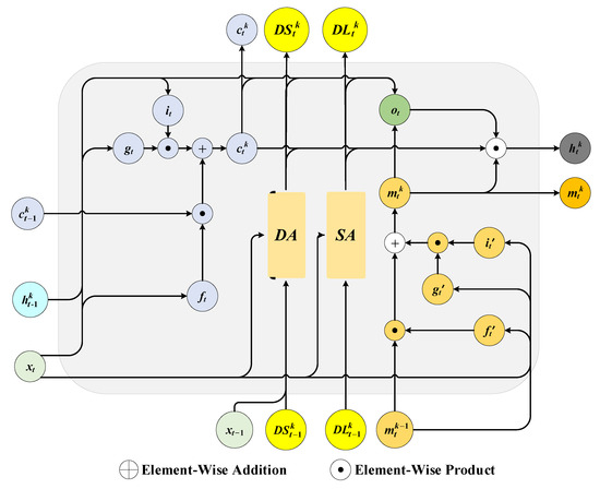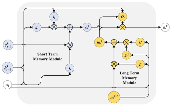 Here, represents the convolutional kernel parameters, “” denotes the convolution operation, “” is the Hadamard product, represents the sigmoid activation function, is the input, denotes the short-term dependent memory at time t, represents the long-term dependent memory at time t, and is the hidden state at time t. Input gates i or , forget gates f or , input modulation gates or , and output gates o, respectively, control the information flow. The structure diagram of ST-LSTM [37] is shown in Figure 1.