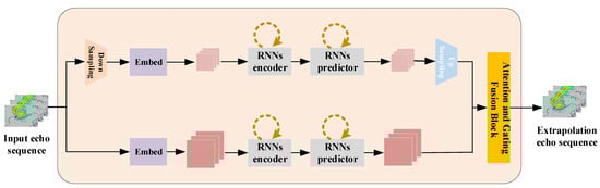Currently, deep learning-based precipitation forecasting can be categorized into four types: utilizing recurrent neural networks (RNN) as iterative prediction models, employing convolutional neural networks (CNN) as feedforward prediction models, using multi-scale methods as prediction models, and integrating attention mechanisms as prediction models. In the feedforward models based on CNN, SimVP [28] consists of an encoder, translator, and decoder [29], all constructed entirely with CNN components without additional modules. STRPM [30] proposes a spatiotemporal encoding-decoding scheme to retain more high-resolution spatiotemporal information. It focuses on the spatiotemporal residual features between the previous and subsequent model time steps and introduces a new loss function called learning perceptual loss (LP-loss). Other CNN-based prediction models primarily use U-net [31] as a foundation, such as RainNet [32], SmaAt-Unet [33], and FURENet [34]. However, CNN-based prediction models struggle to capture long-term dependencies in radar echo image sequences, hindering the effective handling of spatiotemporal relationships in predictions.