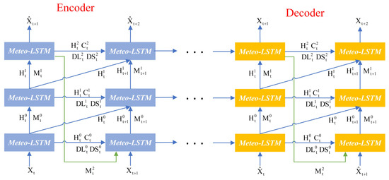 The RNN recurrent part uses an encode-decode architecture, as shown in Figure 3. To efficiently learn meteorological features across spatiotemporal scales, we employ a three-layer Meteo-LSTM as both an encoder and a decoder. Here, , represent meteorological feature memory on the spatial scale and time scale at layer l at time t. These memories are propagated horizontally. , , and correspond to the representations in ST-LSTM [37].