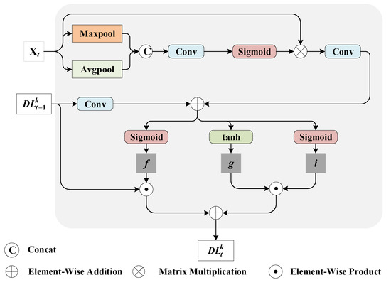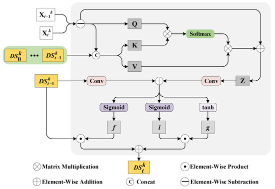To effectively fuse the features obtained by the Spatial Attention Module (SA) and Differential Attention Module (DA), we use Formula (5) for feature fusion. represents the hidden state of the k-th layer at time t. represents the convolution kernel parameter, with a kernel size of 1 × 1.
