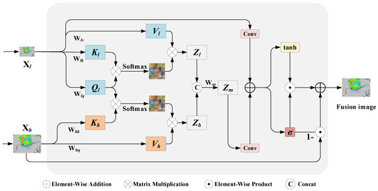 The model takes and as inputs, where represents the low-resolution prediction image and represents the high-resolution image. “” denotes convolution operation, represents convolution kernel parameters, The convolution kernel size is 1 × 1, “” denotes matrix multiplication, σ represents the sigmoid activation function, After convolution, corresponding Q, K, and V are obtained. We use obtained from the low-resolution image as the query for the high-resolution image to focus on regions where local features align with global features. Through attention, we obtain two feature vectors, and . After concatenation and convolution, they are input into the gating mechanism. The gating mechanism adjusts the weights of the input data, allowing for better information processing in different contexts.
