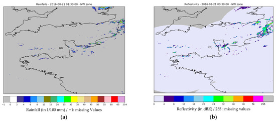 The MeteoNet dataset [52] was collected and organized by the French Meteorological Office. It consists of two regions, each covering an area of 550 km by 550 km. One region is in the northwest of France, and the other is in the southeast. The spatial resolution of the radar is 0.01°, and the projection system used is EPSG:4326. We chose the data from the northwest region of France, spanning three years from 2016 to 2018. The collected dataset includes subsets of rainfall, rainfall radar data quality, and radar reflectivity. An example diagram is shown in Figure 8. The values in the radar reflectivity dataset range from 0 to 70 dBZ, with each observation having a data grid size of 784 × 565 pixels. Data is recorded every five minutes. To achieve precipitation forecasting for the next two hours, one radar echo image is selected every 15 min. A sample consists of 20 radar echo images. For computational convenience and due to limitations in computing power, we downsampled the original resolution data to 128 × 128 pixels. The rainfall radar data quality dataset associates a quality code with each pixel value of the rainfall product, ranging from 0 (very poor) to 100 (perfect), measured in percentages. If the value is missing, it is set to 255.