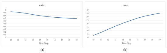 Figure 9 illustrates the variation of prediction performance over time steps. It can be observed that MSE shows an increasing trend, while SSIM shows a decreasing trend. This is because as the prediction time lengthens, the error accumulates for each frame, leading to a continuous increase in prediction loss and a decrease in prediction accuracy.