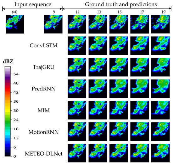 This study used Python as the programming language and PyTorch [53] as the deep learning framework, implemented on an NVIDIA RTX A100 GPU. All models were trained using the Adam optimizer [54], with a batch size of four, an initial learning rate of 10−4, and a training duration of 30 epochs for each model. Early stopping strategy was employed during training, monitoring the validation loss, and halting training when the validation loss ceased to decrease or began to increase, thereby preventing overfitting. To prevent overfitting, this paper employs 5-fold cross-validation. The total of 4500 samples from the training and testing sets are divided into five groups. Validation is conducted on the validation set only when the cross-validation differences are within 1%. The validation set is then used as the final result. To ensure a fair comparison, all models shared the same hyperparameters. The input to the models consisted of 10 consecutive radar echo images with a resolution of 128 × 128, and the output comprised 10 radar echo images. Since the comparative model in this study adopts an encoding-decoding structure, and the first part of the proposed METEO-DLNet also utilizes an encoding-decoding structure, for the sake of fairness and reliability in comparing experiments and ablation experiments, the encoding-decoding structures are equipped with the same number of stacked RNN layers. Moreover, considering that many models compared in the literature often consist of three layers of stacked RNNs in the encoding-decoding structure, this study also employs three layers of Meteo-LSTM stacked to form the encoding-decoding structure. The reverse planning sampling method [39] was also employed to expedite model training. Reverse planning sampling [39] forces the model to learn more about long-term dynamics during the encoding process by reducing the probability of randomly hiding true observations. As the training phase progresses, the probability will decrease.