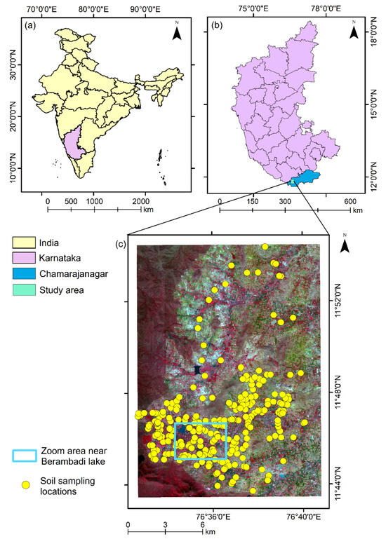 Location of the study area in (a) the state of Karnataka in India (pink polygon) and (b) Chamarajanagar district (bleu polygon) and (c) locations of the 272 topsoil samples (yellow dots) over the AVIRIS-NG False Colo r Composite (R-G-B as 782 nm, 662 nm, and 552 nm) with a zoom area near Berambadi lake (blue rectangle).