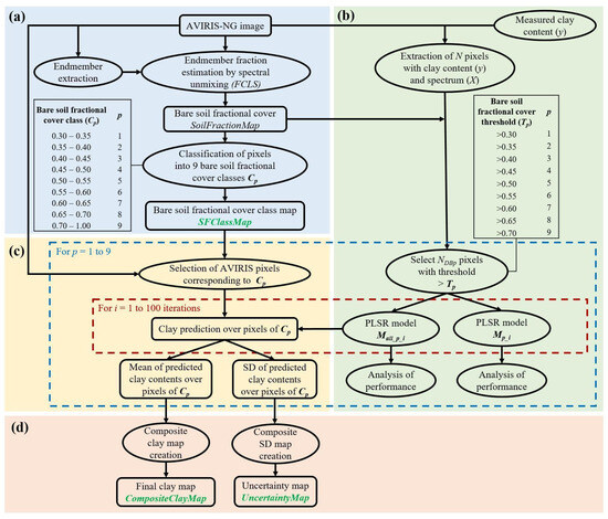 The workflow of the methodology with (a) generation of SFClassMap, (b) building the regression models Mp and Mall_p, (c) application of the models on the AVIRIS-NG image, and (d) creation of the CompositeClayMap and UncertaintyMap (“SD” stands for standard deviation).