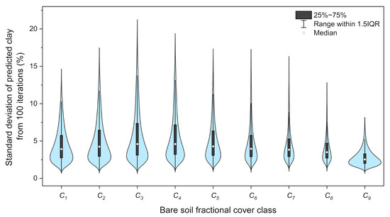 The mean values of the uncertainty in prediction associated with each bare soil fractional cover class varied from 2.81% for C9 to 5.78% for C3, while the median varied from 2.54% for C9 to 4.6% for C3 and C4 (Figure 4). Violin plots for each bare soil fractional cover class Cp were generated to compare the distribution of the uncertainties associated with the class (Figure 4). The higher bare soil fractional cover class C9 was associated with a lower range of uncertainty as compared to the lower bare soil fractional cover classes (Figure 4). Finally, though there was a statistically significant difference between the uncertainties of bare soil fractional cover classes as determined by one-way ANOVA (F(8, 1.1 × 107) = 188,787.14, p < 0.0001), there was no correlation between the bare soil fraction classes (Figure 3a) and the standard deviations (Figure 3c) of predictions over the entire mapped study area (R2 of 0.08, p < 0.0001).