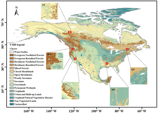 Locations and land cover distributions of the study regions, including areas in WA, CA, MS, NT, and QC, respectively. The base map is the land cover distribution product based on the University of Maryland land cover classification across North America. The enlarged sub-map displays the land cover in each region.