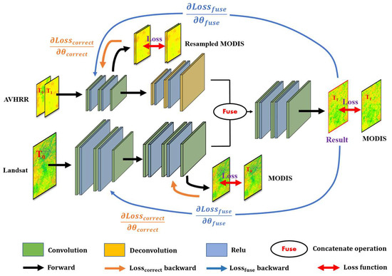where and denote the number of layers for the supervisors of AVHRR- and Landsat-based corrections, respectively. The two correction networks independently adjust the weight parameters to mitigate the systematic biases between the AVHRR and Landsat inputs with their corresponding target MODIS data. The final objective function of the spatiotemporal fusion module is only for the output layer, as follows: