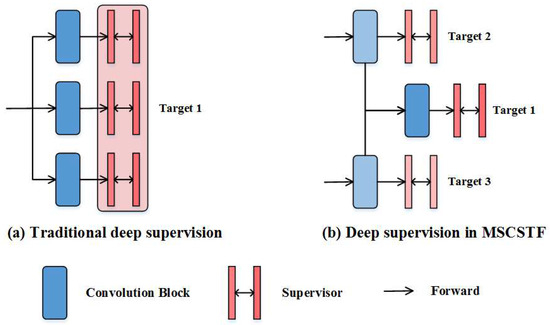 Schematic diagrams of traditional deep supervisions in a traditional form and in MSCSTF.