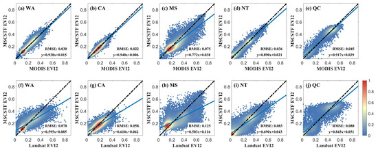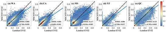 Figure 6 shows scatter density plots between all available cloud-free resampled Landsat data prior to 2000 and the corresponding MSCSTF results in the five regions. The scatter distribution map illustrates that the overall reconstructed MSCSTF results have relatively clustered scatter distributions, small errors, and high linear fitting degrees when compared to the Landsat data. In WA and CA, the error between the MSCSTF results and the validation data is small, with an RMSE of 0.082 and 0.066, respectively, thus indicating robust agreement. In addition, the fitness between them is high, particularly within the EVI2 values below 0.3, exhibiting a dense clustering along the 1:1 line. Note that the results typically present underestimations, with specific underestimations at high values and overestimations at low values, as revealed by the regression slopes of 0.740, 0.689, 0.636, 0.768, and 0.782, along with positive regression intercepts in the respective regions.