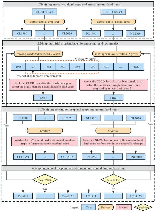 Regarding the above definition, taking the process of cropland abandonment and land reclamation mapping in 1991 as an example, the specific mapping methods are as follows (Figure 2):