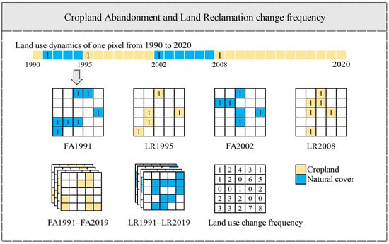 Using the cropland abandonment and land reclamation datasets, we evaluated the frequency of change in abandonment and reclamation (Figure 3). Specifically, we defined a value of “1” for all non-empty pixels in the FA1991–FA2019 and LR1991–LR2019 datasets, while pixels without values were assigned a value of “0”. Subsequently, we summed these values to evaluate the frequency of change in cropland abandonment and land reclamation (refer to the Supplementary Materials for specific codes).
