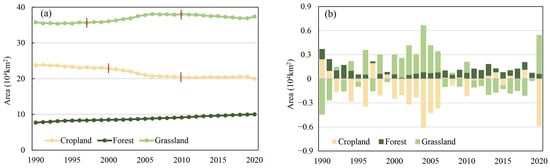 Dynamics of cropland and its relationship with forest and grassland from 1990 to 2020. (a) Area of cropland, forest, and grassland, where red vertical lines indicate the primary year of cropland and grassland change; (b) the net change in cropland, forest, and grassland area. “Net change” refers to land cover/use area changes between two consecutive years.
