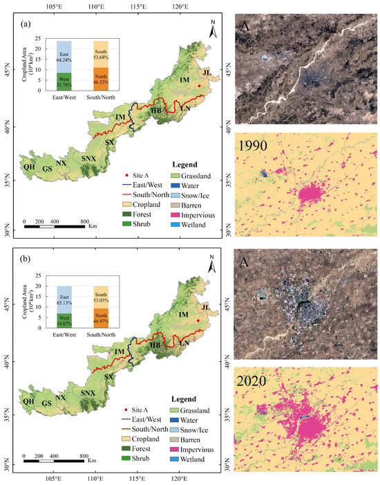 Spatial characteristics of land cover and cropland area proportion in the northern farming–pastoral zone. The left figure shows the comparison of overall land cover changes in the northern farming–pastoral zone; the right figure shows the close-up and Landsat images of the land cover changes at site A (Tongliao City) due to urban expansion. Figures (a,b) represent the land cover in 1990 and 2020, respectively. The western border of Hebei Province is the east–west boundary (blue line), and the southern edge of Inner Mongolia (roughly the Yinshan–Yanshan Mountains) is the north–south boundary (red line). This method of delineation based on administrative regions and mountains reflects the clarity of geographical features and the distinctiveness of regional boundaries. See Figure 1 for the detailed definitions of the abbreviations of province names.