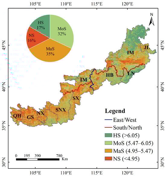 Cropland suitability in the northern farming–pastoral zone is mainly classified as marginal, with a total score ranging from 2.79 to 7.53. According to the natural breakpoint method, the classification intervals for different suitability levels, from low to high, are as follows: NS (2.79–4.95), MaS (4.95–5.47), MoS (5.47–6.05), and HS (6.05–7.53). The spatial distribution of cropland suitability indicates that the western part of the Great Khingan and the Liaohe Plain exhibit better cropland suitability, while the northern part of the North China Plain, the southern part of the Yinshan Mountains, and the central and southern part of the Loess Plateau have moderate suitability. Conversely, the western part of the Loess Plateau and the West Liaohe Basin exhibit low cropland suitability (Figure 6).
