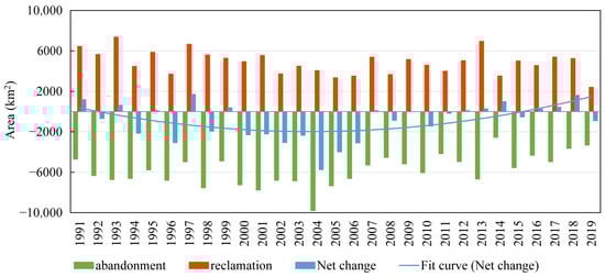 Temporal dynamics and net effects of abandonment and reclamation from 1991 to 2019. The fitting method is a second-order polynomial fit.