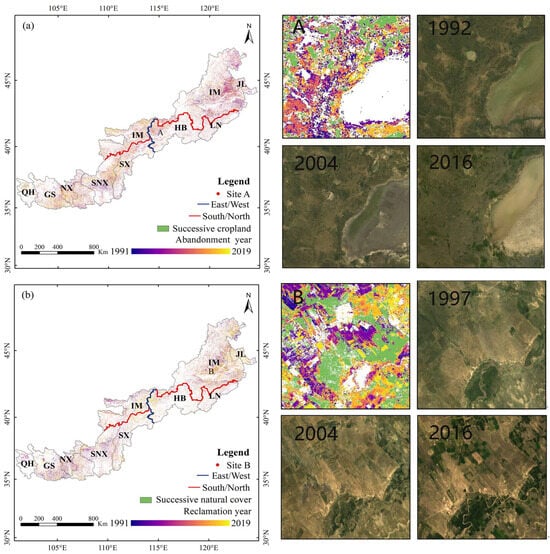 Spatiotemporal pattern of abandonment and reclamation from 1991 to 2019. Figures (a,b) show the cropland abandonment and land reclamation, respectively. The right figures correspond to close-ups of site A (cropland abandonment, fallow, and successive cropland) and site B (land reclamation, successive natural land), respectively, and Landsat images at different times (RGB321). See Figure 1 for the detailed definitions of the abbreviations of province names.