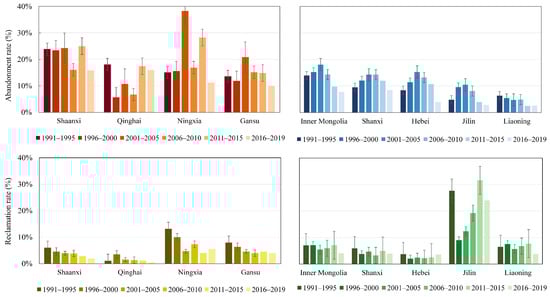 Moreover, the abandonment rate in Shaanxi was almost consistently high (16–24%), mainly due to policies such as returning cropland to forests in the Loess Plateau. Similarly, two significant land patterns of reclamation were observed in different regions. In Jilin, Inner Mongolia, Liaoning, and Hebei, the land reclamation rates continuously increased from 2001 to 2015 but decreased from 2016 to 2019, with the most significant decrease observed in Jilin (−15%). In contrast, in Ningxia, Gansu, Shaanxi, Shanxi, and Qinghai, the land reclamation rates decreased from 1991 to 2019 and eventually stabilized at a lower level.
