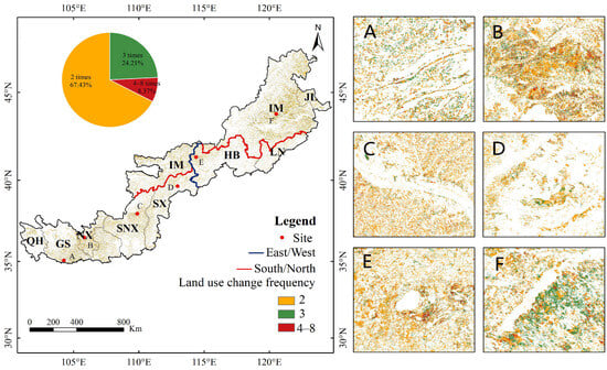Abandonment and reclamation change frequency from 1991 to 2019. The right figures (A–F) show the land use change frequency in typical sites of Gansu, Ningxia, Shaanxi, Shanxi, Hebei, and Inner Mongolia, respectively. In particular, this change excludes directional information, i.e., from abandonment to reclamation or reclamation to abandonment. See Figure 1 for the detailed definitions of the abbreviations of province names.