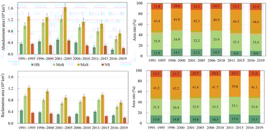 Trends of the suitability of cropland abandonment and land reclamation over time. The left figures show the sum of the abandoned or reclaimed area in each period, and the right figures show the mean value of the rate of the reclaimed or abandoned area in each period.