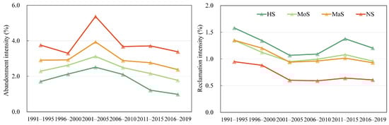 From the intensity of abandonment and reclamation (the rate of the change in abandoned area to cropland area/reclaimed area to natural land area) in areas of different suitability, the land abandonment intensity in HS and MoS is low (2.02–2.93%), and the intensity of land reclamation is relatively high (2.75–5.63%). In contrast, the land reclamation intensity in MaS and NS is low (1.54–2.3%), and the intensity of land abandonment is relatively high (5.75–9.31%). The results demonstrate that both the government’s land use policy at the macro level and the individual farmers’ decisions at the micro level are quite rational in determining abandoned and reclaimed land (Figure 12).
