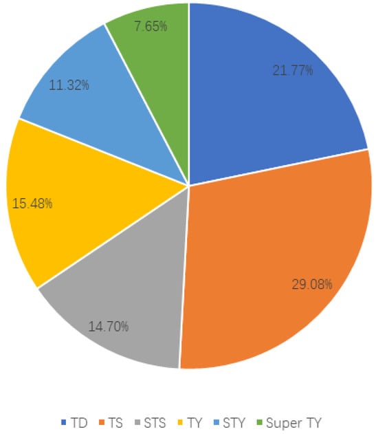 The dataset covers all tropical cyclones passing through China’s coastal regions from 2016 to 2022 with data augmentation by rotation, and the training set contains 2686 ice cloud scenarios after rotation (there were 1343 scenarios before rotation). As shown in Table 3, the China Meteorological Administration (CMA) categorizes tropical cyclones into six levels based on the maximum mean wind speeds near the surface center. According to the classification criteria, the proportion of tropical cyclones in each intensity category in the dataset is shown in Figure 4. The proportions of tropical cyclones in each intensity category were ranked from high to low as follows: Tropical Storm (TS, 29.08%), Tropical Depression (TD, 21.77%), Typhoon (TY, 15.48%), Severe Tropical Storm (STS, 14.70%), Strong Typhoon (STY, 11.31%), and Super Typhoon (Super TY, 7.65%). To validate the generalization capability of the CNN networks, the test set includes tropical cyclone scenarios across all intensity levels, as listed in Table 4.