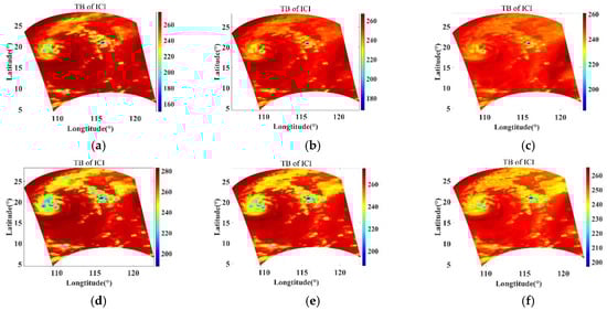 Simulated ATMS TBs of Typhoon SARIKA in the dataset: (a) 165.5 GHz; (b) 183.31 ± 7 GHz; (c) 183.31 ± 4.5 GHz; (d) 183.31 ± 3 GHz; (e) 183.31 ± 1.8 GHz; and (f) 183.31 ± 1.8 GHz.