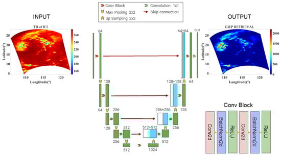 The Unet network [] is a convolutional neural network with an encoder–decoder structure that was proposed by Olaf Ronneberger et al. in 2015; its name comes from the U shape of the network architecture. Unet was originally used for medical image segmentation. After its proposal, many studies built new models on the basis of Unet for new applications [,,,]. In this work, the Unet network was utilized for ice cloud parameter retrieval as a benchmark algorithm.