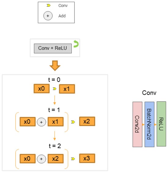 On the basis of the original Unet network, we incorporated recurrent convolutional layers [] and residual structure design [] to construct the RCNN–ResUnet network architecture, as shown in Figure 8 and Figure 9. Specifically, the encoder and decoder modules in RCNN–ResUnet both employ recurrent convolutional layers instead of regular convolution layers. Recurrent convolutional layers can accumulate feature information, which is beneficial for image–related tasks. In addition, RCNN–ResUnet inserts residual units after the recurrent convolutional layers to form recurrent residual convolutional modules. The residual structure facilitates the training of deeper models.