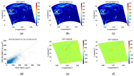 IWP retrieval results for Typhoon SARIKA. (a) The reference truth; (b) Unet retrieval; (c) RCNN–ResUnet retrieval; (d) scatter plot of RCNN–ResUnet retrieval; (e) error of Unet retrieval; and (f) error of RCNN–ResUnet retrieval. The red line in (d) represents the function y = x.