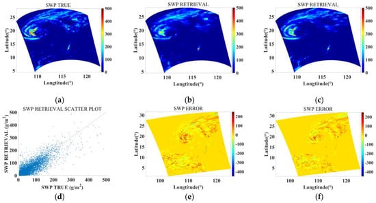 Figure 11, Figure 12 and Figure 13 show the experimental results of jointly retrieving GWP, IWP, and SWP for the SARIKA scenario using Unet and RCNN–ResUnet, respectively, where (a) is the “reference truth” in the test data, (b) is the retrieval result of Unet, (c) is the retrieval result of RCNN–ResUnet, (d) is the scatter plot of RCNN–ResUnet retrieval, (e) is the error of Unet retrieval and (f) is the error of RCNN–ResUnet retrieval. It can be seen that for ice, snow, and graupel particles, both Unet and RCNN–ResUnet can accurately retrieve the spatial distribution characteristics of GWP, IWP, and SWP.