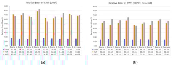 Figure 14a,b show the percentage errors of GWP, IWP, and SWP retrieved by Unet and RCNN–ResUnet, respectively, for all eight test scenarios. Using Unet, the relative error of the GWP is between 15% and 18% for all test data, with an average of 16.34%; the IWP relative error ranges from 62% to 79%, with an average of 68.2%; and the SWP relative error is between 54% and 83%, with an average of 69.14%. Using the RCNN–ResUnet, the relative error of the GWP is between 12% and 16%, with an average of 14.48%; the IWP relative error ranges from 47% to 58%, with an average of 51.38%; and the SWP relative error is between 45% and 65%, with an average of 57.01%.
