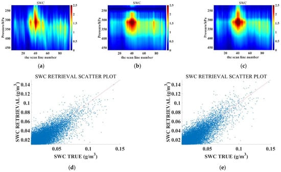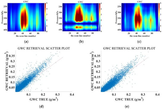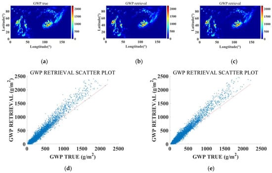 GWC retrieval results of the ATMS simulation. (a) Reference truth; (b) Unet retrieval; and (c) RCNN–ResUnet retrieval. The red line in (d,e) represents the function y = x.