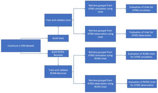 Step 4: The well trained Unet and RCNN–ResUnet networks are applied to the ATMS simulation in the test set and corresponding ATMS observation to retrieve graupel parameters;