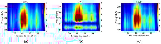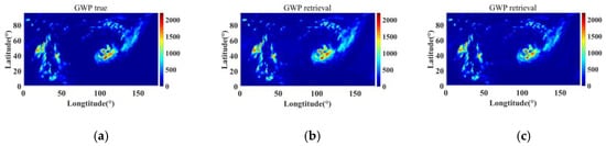 GWP retrieval results of the ATMS simulation. (a) Reference truth; (b) Unet retrieval; and (c) RCNN–ResUnet retrieval.