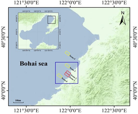Map of study area in the vicinity of Bayuquan in Liaodong Bay. The coverage of PolSAR data is represented with red and yellow rectangles, and the coverage of Sentinel-2 images is delineated by the blue rectangle, and the black rectangle in the Bohai inset map shows the geographical location of the study area.