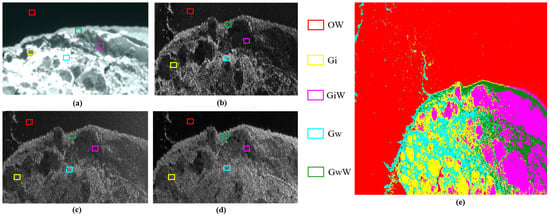 The current sea-ice naming standard for the Bohai Sea primarily focuses on sea-ice types during the freezing period and does not provide detailed classification for sea-ice types during the melting period []. While we did not have access to field measurements to validate the results, in this study, we utilized Sentinel-2 data with a resolution of 10 m to determine sea-ice types, enhancing the credibility of our approach. Simultaneously, we sought the expertise of multiple sea-ice research specialists to assess the sea-ice types in the experimental area, ensuring the accuracy of the sea-ice validation results. This study specifically classifies the sea ice in the experimental data into five types: open water (OW), gray ice (Gi), melting gray ice (GiW), gray–white Ice (Gw), and melting gray–white ice (GwW). This classification accounts for sea-ice types during the melting period and provides a more detailed breakdown of the sea-ice categories.