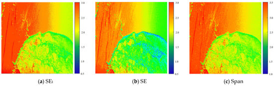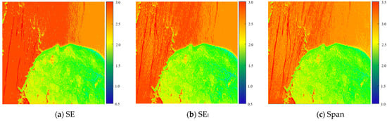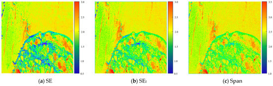 In the L-band, there are a total of 12 polarimetric features with Ice Type values greater than or equal to 1.2, with SE showing the highest sea-ice classification capability, having an Ice Type value of 2.75. The specific values of ED for these 12 polarimetric features in different classification combinations can be found in Figure 5, and the polarimetric feature images with the top three Ice Type values are displayed in Figure 6.