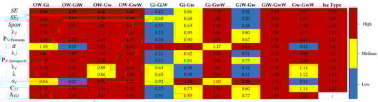 In this context, m and σ² represent sample mean and variance, and the Euclidean distance (ED) satisfies D > 0. The larger the value of the Euclidean distance, the stronger the separability between two types of samples, and vice versa. As indicated by the above formula, the greater the difference in means and the smaller the variance between regions, the larger the ED, and thus, the stronger the separability. In this study, we calculated the ED values for any two combinations among the five types, as follows: OW–Gi, OW–GiW, OW–Gw, OW–GwW, Gi–GiW, Gi–Gw, Gi–GwW, GiW–Gw, GiW–GwW, and Gw–GwW, making a total of 10 combinations. If the ED value of polarization features in the sea-ice type combination is less than 0.6, we consider the separability of that feature within the combination to be low. When the ED value is greater than or equal to 0.6 but less than 1.2, we consider the separability to be medium. However, if the ED value is greater than or equal to 1.2, we classify it as high separability within that combination.