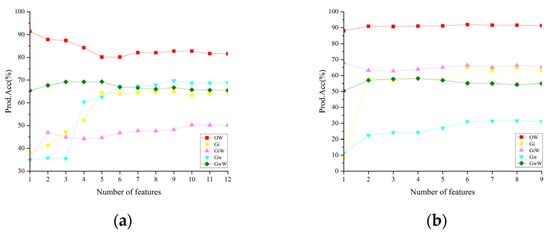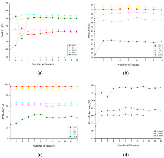 Furthermore, we constructed the eligible polarization features into polarization feature sets for each frequency band. Combining the RFE method, we input the feature sets into the SVM classifier and obtained classification results for different feature counts in each band. The results revealed that in the C-band, OW and Gi had the highest classification accuracy, GiW achieved the highest classification accuracy in the S-band, while Gw and GwW had the highest classification accuracy in the L-band. This can be attributed to the strong electromagnetic wave absorption of seawater at low frequencies. In the L-band images, the backscatter coefficient of seawater is lower, approaching the base noise level, resulting in lower classification accuracy for OW. Sea ice usually has a rough surface, and the L-band has better electromagnetic wave penetration capability, providing richer information about the internal structure of sea ice. Therefore, it achieves higher classification accuracy for rough sea-ice types like Gw and GwW, which is consistent with the findings in [,].