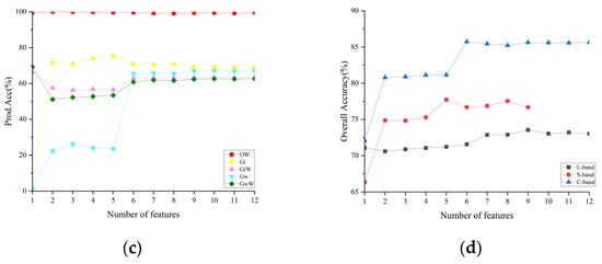 Observing Figure 14d, we find that, unlike Scene 1, in Scene 5, the overall classification accuracy using the L-band feature set is the highest. This is because the classification accuracy is related to the number of sea-ice samples in the data, and in Scene 5, the number of sea-ice samples is much higher than that of seawater. Therefore, the L-band has higher classification accuracy among sea-ice classes compared to the C-band, resulting in higher overall classification accuracy. However, by observing Figure 14a–c, we can see that the classification capabilities of single-band feature sets among different sea-ice types are consistent with Scene 1. Specifically, OW and Gi have the highest classification accuracy in the C-band, GiW has the highest classification accuracy in the S-band, and Gw and GwW have the highest classification accuracy in the L-band. Moreover, the number of features required to achieve the highest classification accuracy in each band is consistent with Scene 1. Therefore, we can consider the single-band optimal feature set discussed in this study to be applicable to some extent.