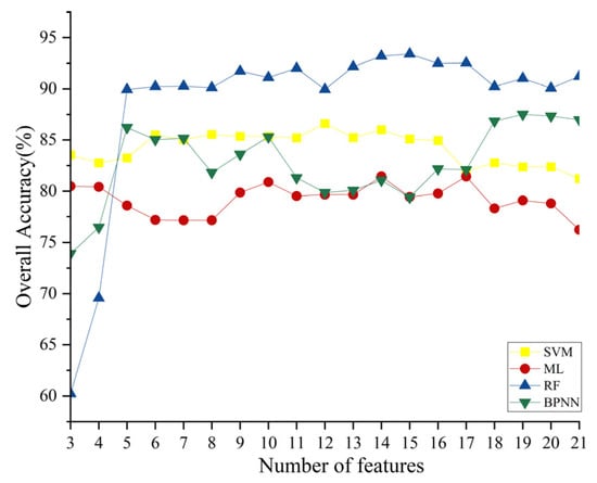 Based on the arrangement of all features in the single-band feature set in Table 10, sorted in descending order of AED, we constructed a multi-band feature set. This multi-band feature set was sequentially input into different classifiers, and the classification results under different feature scenarios were discussed. The variation in overall classification accuracy is illustrated in Figure 15.