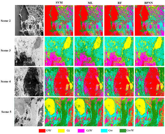 To ensure that the new sea-ice classification method based on feature selection from multi-dimensional SAR observational data proposed in this paper is equally applicable to other scenes, we selected four additional scenes for result comparison and validation. Among them, Scene 5, which has a different collection location and date from Scene 1, was chosen for single-band classification results and for comparing the selection of multi-band features and classifiers. The other three scenes were used to validate the feasibility of the method.
