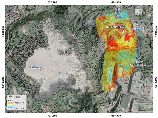 From 2019 to nowadays, UAS flights have been executed monthly in the Pisciarelli area during the evening and/or night, in any case, always in absence of solar irradiation. The flights were performed using a thermal camera FLIR Vue Pro R (technical details are in Silvestri et al., 2020 [] and in Caputo et al. 2023 []).